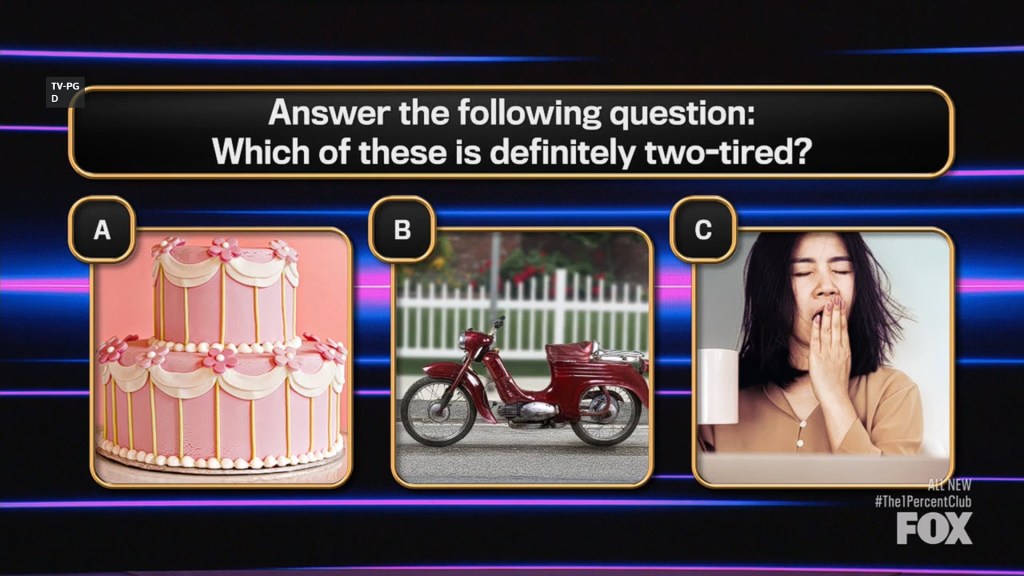 – The cake is two-TIERED. The woman is T-O-O tired. And the moped is the only one that is two-tired.20% Question & Answer