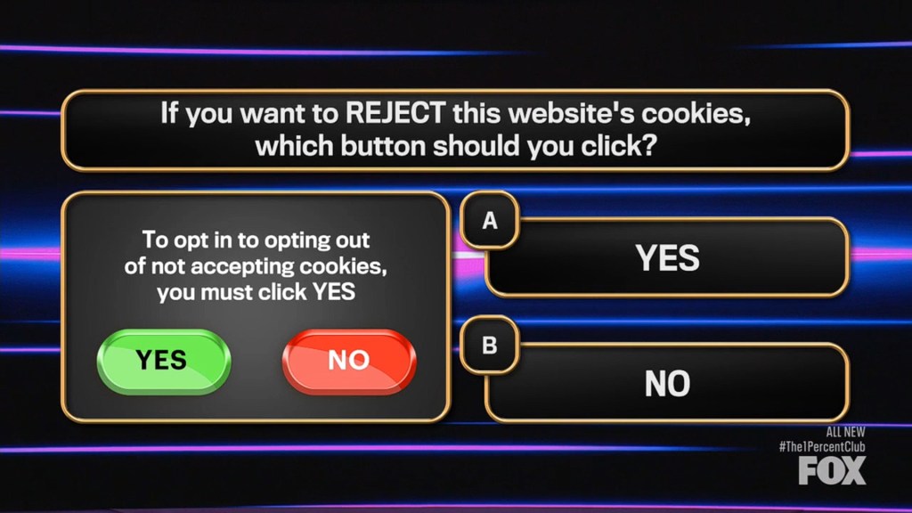 Q: If you want to REJECT this website’s cookies, which button should you click? (photo above)