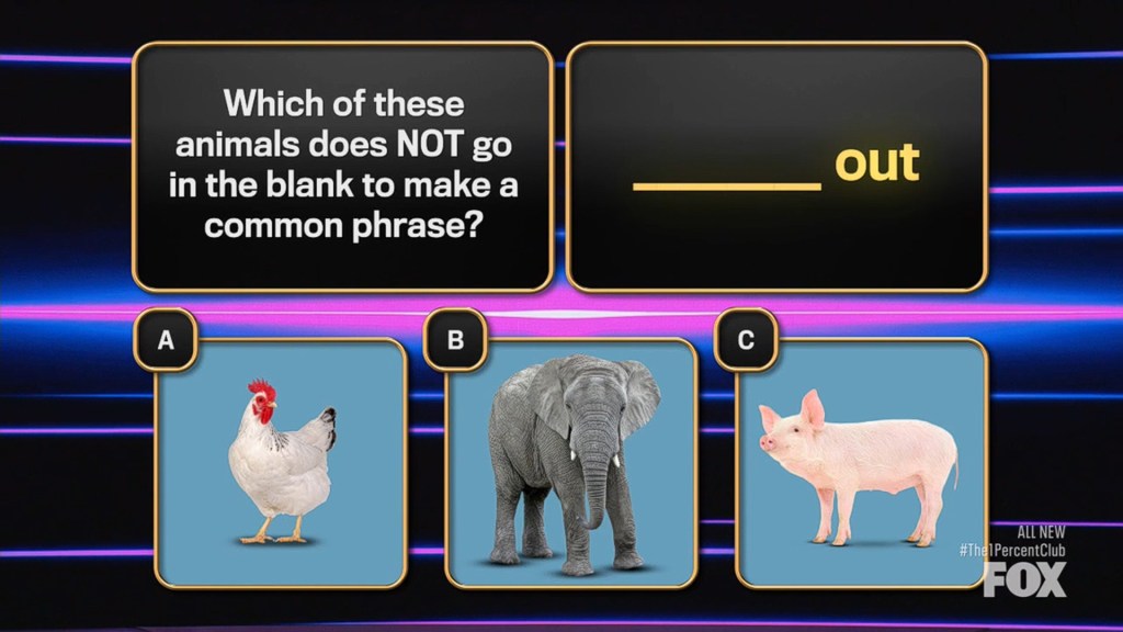 – B: Elephant. You can chicken out if you’re scared and pig out if you’re hungry, but elphant out is not a common phrase.70% Question & Answer