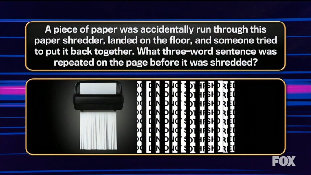 – DO NOT SHRED. When the pieces of paper are placed back together, the three-word sentence “DO NOT SHRED” is repeated on the page.45% Question & Answer