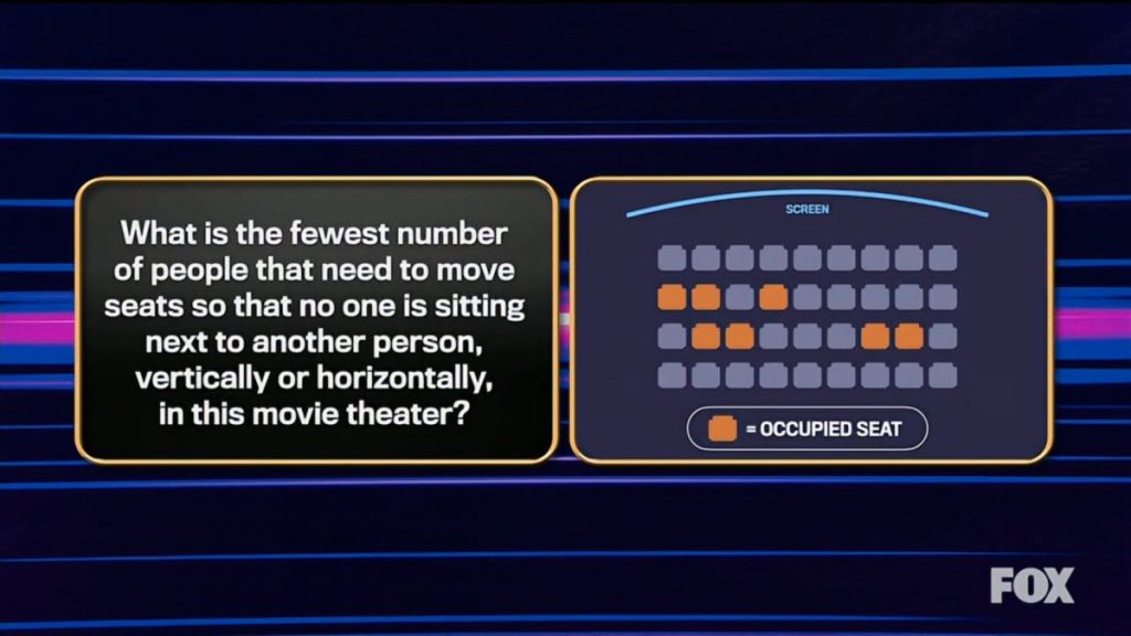 Q: What is the fewest number of people that need to move seats so that no one is sitting next to another person, vertically or horizontally, in this movie theater? [image above]