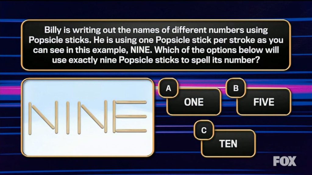 Q: Billy is writing out the names of different numbers using Popsicle sticks. He is using one Popsicle stick per stroke as you can see in this example, NINE. Which of the options below will use exactly nine Popsicle sticks to spell its numbers? [image above]