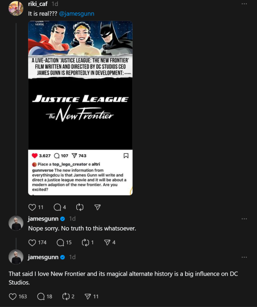 “Nope sorry. No truth to this whatsoever,” said Gunn. “That said, I love New Frontier and its magical alternate history is a big influence on DC Studios.”