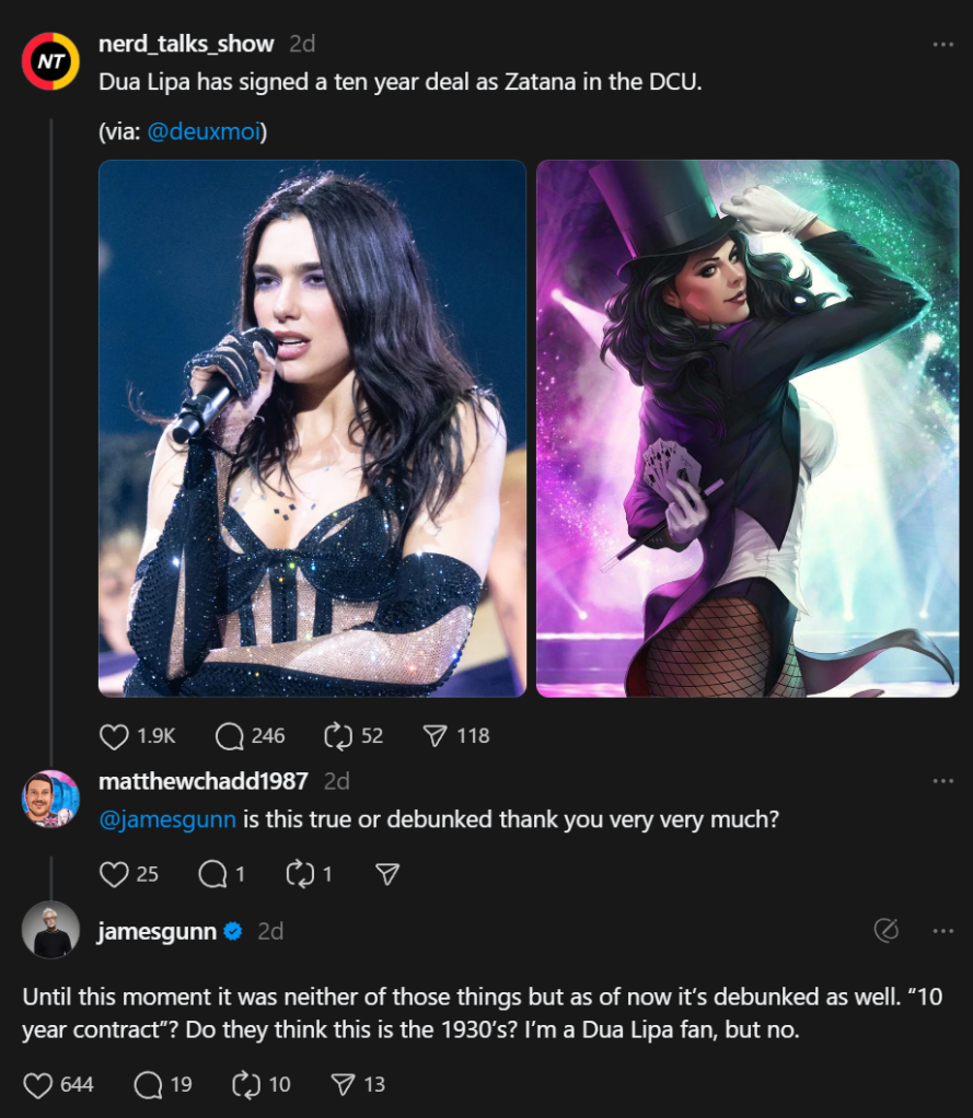Recently, rumors have begun flying that Dua Lipa had signed a massive, 10-year-long contract to play the character of Zatana in the DCU. The rumor was shared by the popular Instagram account DeuxMoi, but Gunn took to Threads to address the noise.