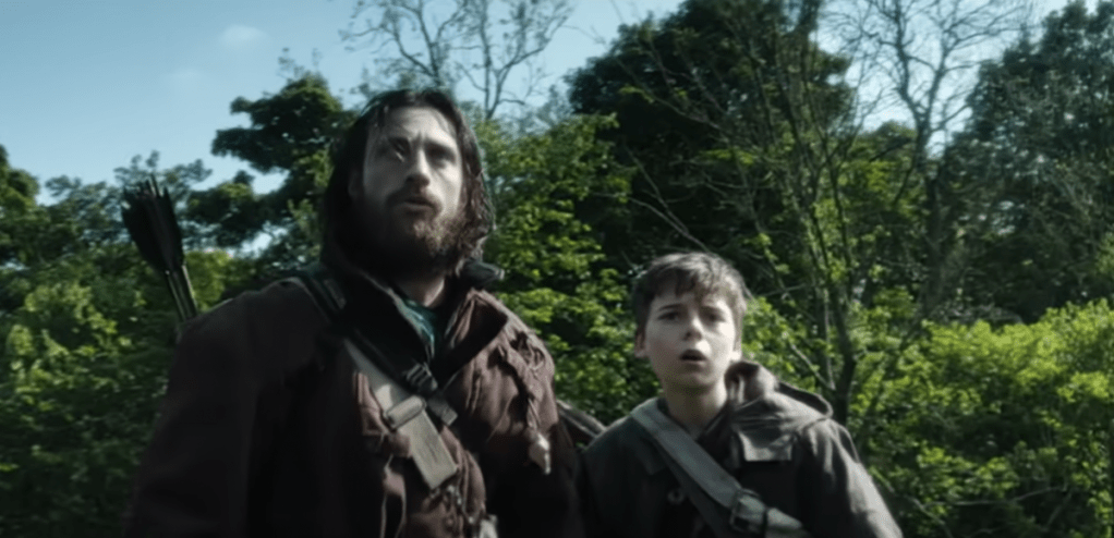 These shots occur right when a character has been shot, and we’ll often freeze, arc around the character, and then unfreeze. It’s not horrible, but it is a bit distracting when it happens. An early scene also has Jamie and Spike walking through the forest, intercut with archival footage. It’s also a bit distracting because we’re not really seeing this scene through Jamie or Spike’s perspectives; we’re seeing it through director Danny Boyle’s. It’s not always clear what he’s trying to tell us in this moment, even if his imagery is as visually arresting as ever. Boyle’s shot composition puts you on edge so that we’re almost always feeling the emotions and danger of our characters.